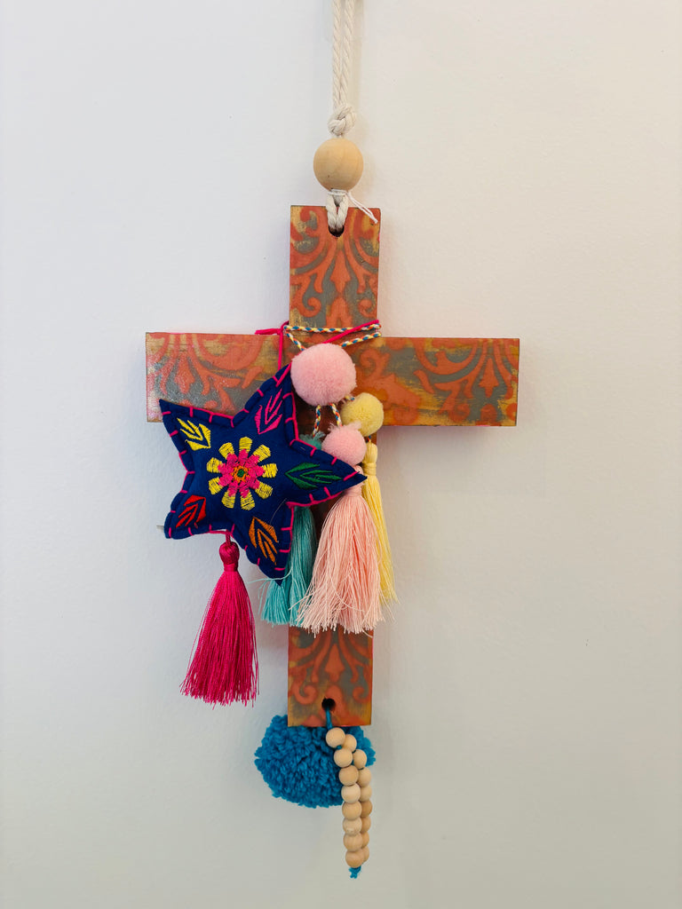 handpainted 25 cm wooden cross! Perfect for adding character to any room, this decorative cross is a unique and charming addition to your decor. Each one is lovingly crafted, making it a one-of-a-kind piece.
